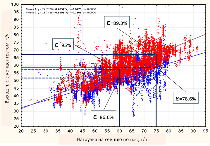 На рисунке представлены сравнительные результаты. Особенностью данного месторождения является значительные колебания по содержанию полезного компонента в руде. На это накладываются постоянные изменения нагрузки на секцию. Чтобы это учесть, на рисунке показаны зависимости количества полезного компонента, выходящего с концентратом, от поступающего количества полезного компонента с питанием.